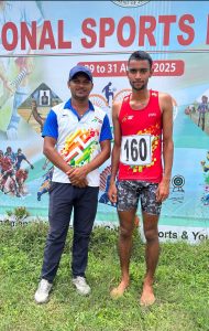देवघर। खेल कूद एवं युवा कार्य निदेशालय रांची द्वारा 29 अगस्त को राष्ट्रीय खेल दिवस के अवसर पर 29 से 31 अगस्त तक बिरसा मुंडा फुटबॉल स्टेडियम, मोराबादी में आयोजित तीन दिवसीय खेल महोत्सव (एथलेटिक्स ) में जिले के एथलीट ने शानदार प्रदर्शन करते हुए एथलेटिक्स खेलो इंडिया सेंटर देवघर के एथलीट सुमित सिंह ने प्रशिक्षक दीपक कुमार के नेतृत्व में बालक ट्रिपल जंप  में सुमित सिंह ने 14.06 मीटर के साथ रजत पदक जीता। इस उपलब्धि पर जिला खेल पदाधिकारी संतोष कुमार, जिला एथलेटिक्स संघ के अध्यक्ष डॉ सुनील खवाडे, आशीष झा, मनोज मिश्रा, जिला खेल कार्यालय के रजनीश कुमार, चंदन कुमार, गौरव कुमार  समेत जिलेवासियों ने खिलाड़ियों को बधाई दी।