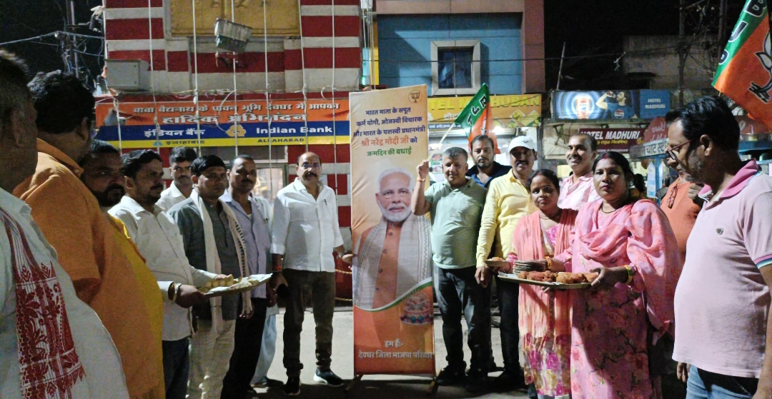 देवघर। प्रधानमंत्री मोदी के 75 वें जन्मदिन पर भाजपा देवघर नगर कमेटी की ओर से बुधवार को सदर अस्पताल में मरीजों के बीच फल वितरण किया गया। वहीं देर शाम स्थानीय टावर चौक पर पीएम नरेंद्र मोदी के चित्र पर तिलक लगा कर व मिठाई खिलाकर जन्मोत्सव मनाया गया। कार्यक्रम के अंतिम क्षण में गोड्डा लोकसभा क्षेत्र के सांसद डॉ निशिकांत दुबे अपने काफिले के साथ पहुंचे लेकिन अपने वाहन से नहीं उतरे और मिठाई ग्रहण कर चलते बने। मौके पर पूर्व विधायक नारायण दास सहित अन्य भाजपा कार्यकर्ता उपस्थित लोगों के बीच मिठाई, समोसा, वेजिटेबल, लड्डू भी वितरित किया गया। कार्यक्रम का आयोजन नगर अध्यक्ष धनंजय खवाडे के नेतृत्व में किया गया।