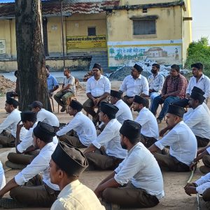 शस्त्र पूजन के बाद उपस्थित स्वयंसेवकों ने बौद्धिक किया ग्रहण