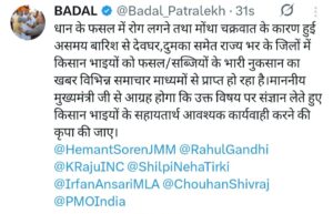 पूर्व कृषि मंत्री बादल पत्रलेख ने किया था ट्वीट